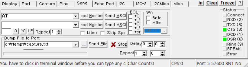 12. AT를 입력 후 바로 그 줄 오른쪽에 있는 'Send ASCII' 버튼을 누른다(아래 그림 참조)